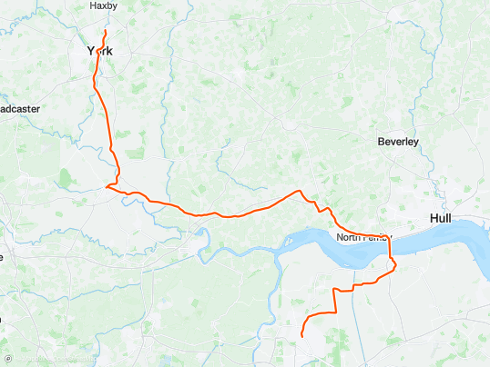 Adjusted route last night replacing unpaved sections. Alas with some busy B roads and missed a bit down a National Byway south of the Humber . As with all days, we recheck and remove all unpaved/cycleways.